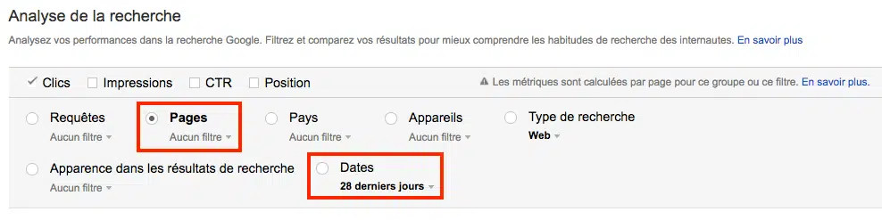 - Clics : le nombre brut de clics sur le lien de votre page dans les SERPs.