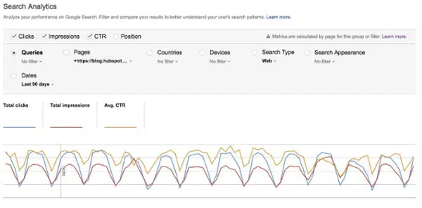 - Position, qui désigne le rang moyen sur les différentes requêtes qui affichent le lien de votre page. Cet indicateur doit être pris avec des pincettes, car il ne tient pas compte du poids respectif (c’est-à-dire du volume) des requêtes. Si vous êtes positionné en rang 1 sur une grosse requête et en rang 9 sur une toute petite requête, vous aurez une position de 5.