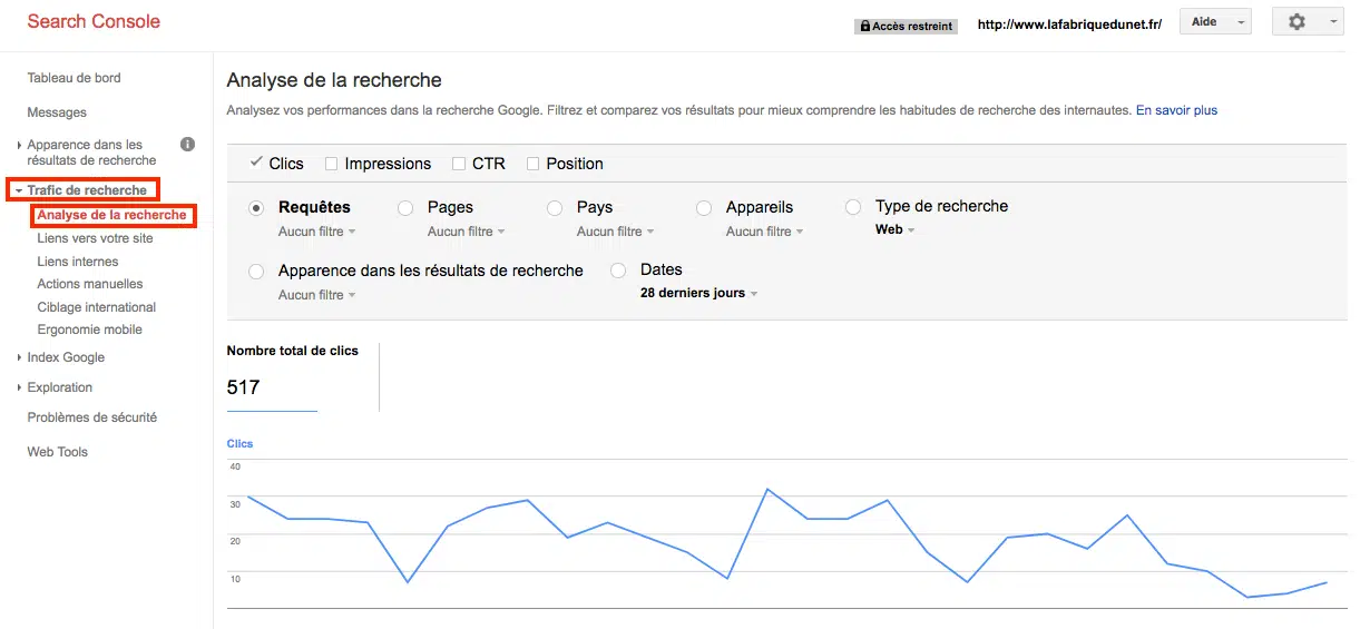 Pour diagnostiquer une baisse de trafic SEO sans pertes de positions SEO, vous pouvez aussi utiliser Google Search Console. Sur votre compte, rendez-vous dans « Trafic de recherche » > « Analyse de la recherche » :