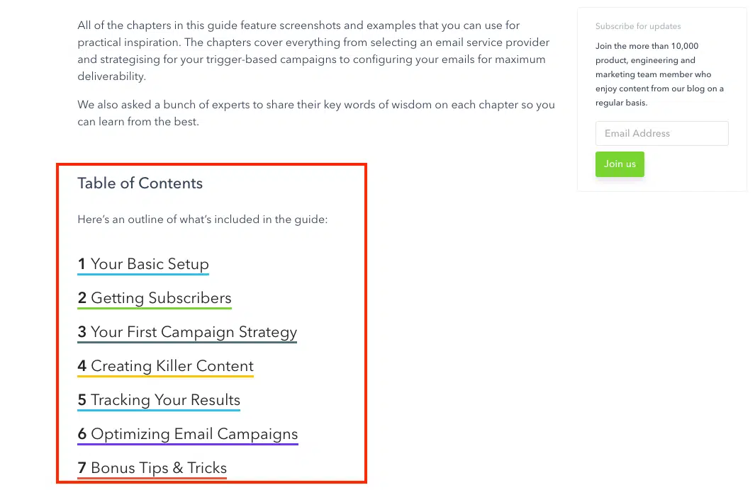 Si vous écrivez un article sur un aspect avancé d’un sujet, l’article doit commencé par une partie de type « guide pour débutants » qui rappelle le contexte et les bases. Cela permettra aux lecteurs initiés de plonger dans la lecteur de votre article plus facilement. Nous vous conseillons aussi d’intégrer au début de l’article (sous l’introduction) une table des matières interactive, générée automatiquement si possible (par exemple via des fonctionnalités natives des CMS modernes ou des plugins spécialisés comme Easy Table of Contents ou les modules intégrés à WordPress, Webflow ou Notion), afin de faciliter la navigation et d’améliorer l’expérience utilisateur, notamment sur mobile. Voici un exemple (guide sur l’email marketing de GetVero) :