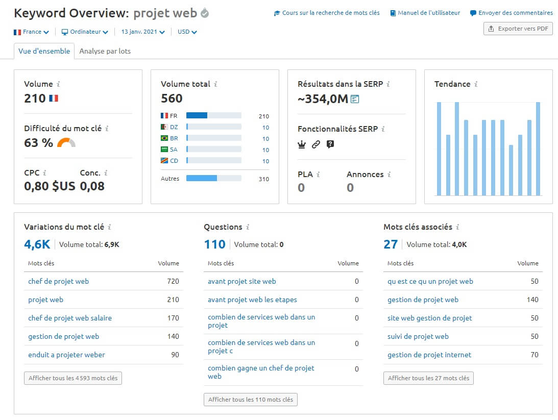 Semrush vous permet de trouver très facilement toutes les informations ci-dessus. Il vous suffit d’entrer un mot-clé dans l’outil « Vue d’ensemble des mots-clés » et vous verrez immédiatement :