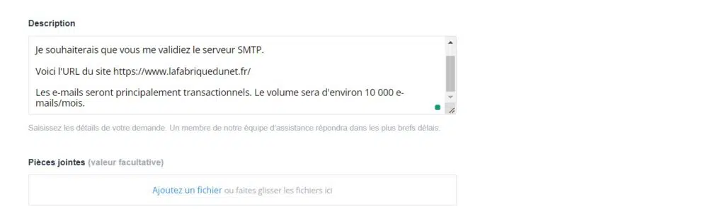 Une fois votre domaine enregistré, vous devez demander l’activation de votre compte Sendinblue SMTP. Pour ce faire, créez simplement un ticket d’assistance et envoyez les informations suivantes :