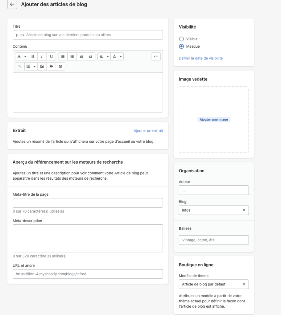 On l’a évoqué, le blog est un formidable outil d’acquisition de trafic pour votre boutique Shopify. Pour attirer des visiteurs, créez des articles de blog à partir de mots-clés et intentions de recherches, donnez de l’information détaillée, utile, éduquez et répondez aux questions de votre cible, pour ensuite rediriger vers des produits. L’avantage de Shopify, est de pouvoir créer un blog simplement, via l’outil canaux de vente.