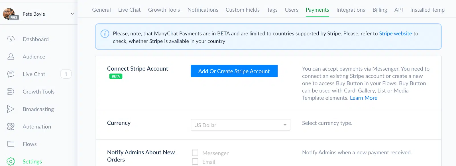 Une fois que vous vous êtes inscrit à ManyChat et que vous l’avez connecté à votre compte professionnel Facebook, rendez-vous dans Settings > Payments.