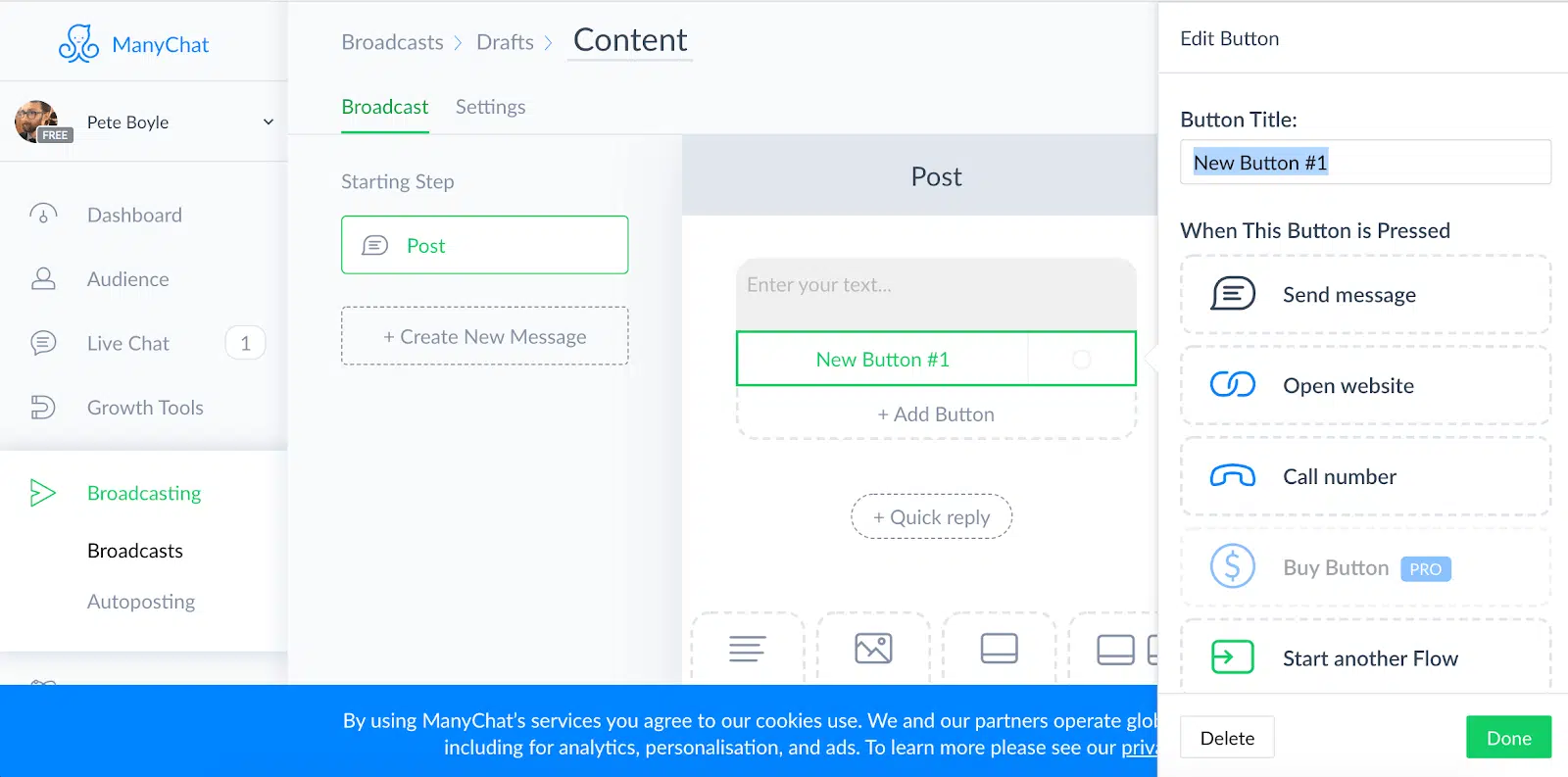 Une fois que vos options de paiement auront été configurées, vous devez travailler au message qui servira à générer des ventes. Pour cela, vous devez aller dans Broadwasts et cliquer sur Add Button > Buy Button.