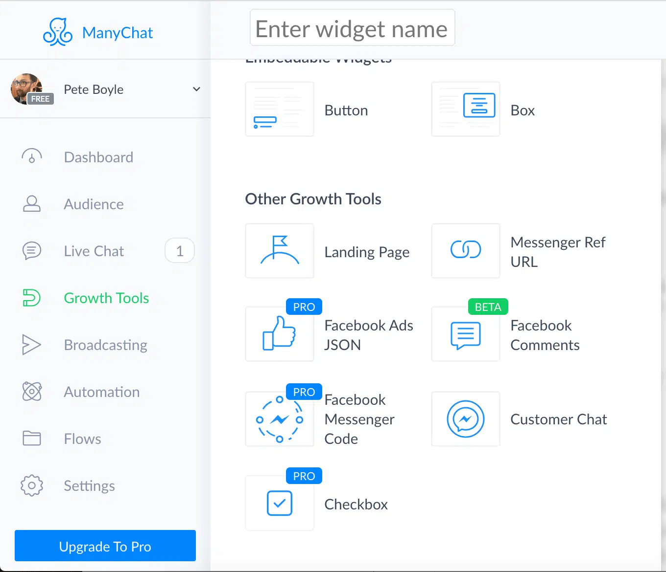 Les étapes que l’on vient de voir constituent vraiment la base de la base pour créer un bouton d’achat sur ManyChat. Une fois le bouton prêt, vous devez l’intégrer sur Facebook, dans vos annonces. Encore une fois, vous devez avoir un forfait premium pour pouvoir le faire. Comment faire ? Vous devez implémenter le message via le widget Facebook Ads JSON, dans le menu « Growth Tools ».