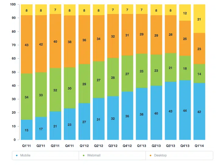 Les résultats sont légèrement différents de ceux de Litmus, mais vont clairement dans le même sens. L’étude de Campaign monitor concerne l’évolution des usages entre le premier trimestre 2011 et le premier trimestre 2014. Au premier trimestre 2014, les emails sont ouverts à 42% sur mobile (contre 15% au premier trimestre 2011).