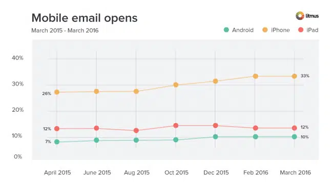 Dans la même étude, Litmus montre que l’iPhone est l’appareil mobile le plus utilisé pour l’ouverture des emails : 33% des emails sont ouverts sur un iPhone, contre 12% pour l’iPad et seulement 10% pour les appareils sous Android :