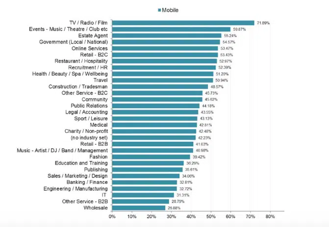 Ces statistiques emailing pour le mobile varient dans des proportions assez importantes d’un secteur d’activité à l’autre. C’est ce que montre une étude de Sign-up.to réalisée sur plusieurs milliards d’emails (entreprises anglaises uniquement) :