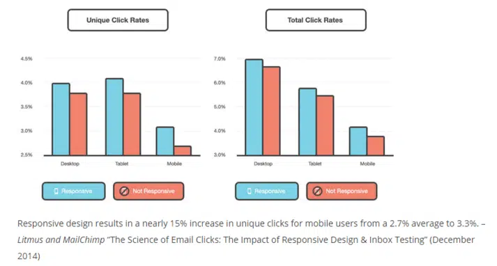 Selon une autre étude réalisée par Litmus en partenariat avec MailChimp et publiée en décembre 2014, il apparaît que le taux de clics est plus faible sur mobile :