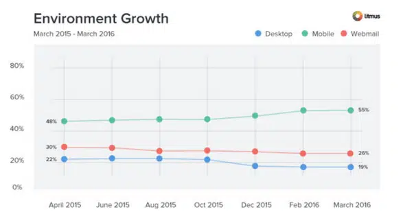 Un premier constat saute aux yeux en prenant connaissance de cette étude de Litmus : plus d’un email sur deux est aujourd’hui ouvert sur mobile. 55% pour être précis, contre seulement 19% sur desktop. Cette évolution est une tendance lourde que l’on observe depuis plusieurs années. En 4 ans, l’utilisation du mobile pour l’ouverture des mails a bondi de 500%.