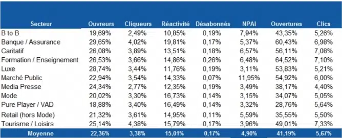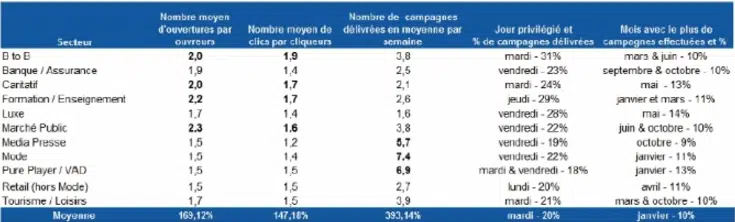 Tableau 1 – Statistiques emailing France / secteurs d’activités d’Experian (e-marketing.fr) :