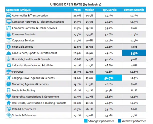 Ces statistiques proviennent de 750 entreprises représentant plus de 3 000 marques dans 40 pays différents. Les meilleures performances sont réalisées par les entreprises de tourisme. Le tau d’ouverture, pour les entreprises de tourisme se situant dans le premier quartile, atteint 56,7%.