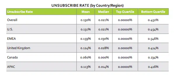 Ce tableau, toujours tiré de l’étude Silverpop de 2015, indique les statistiques d’email marketing concernant le taux de désincription :