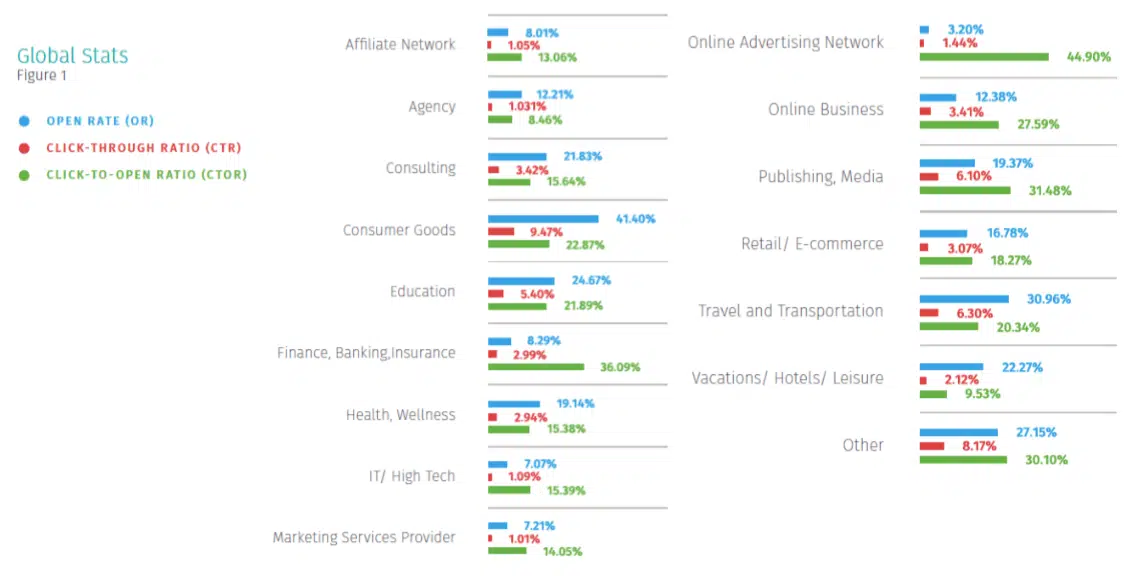 Voici maintenant quelque statistiques d’email marketing par secteur au niveau mondial.
