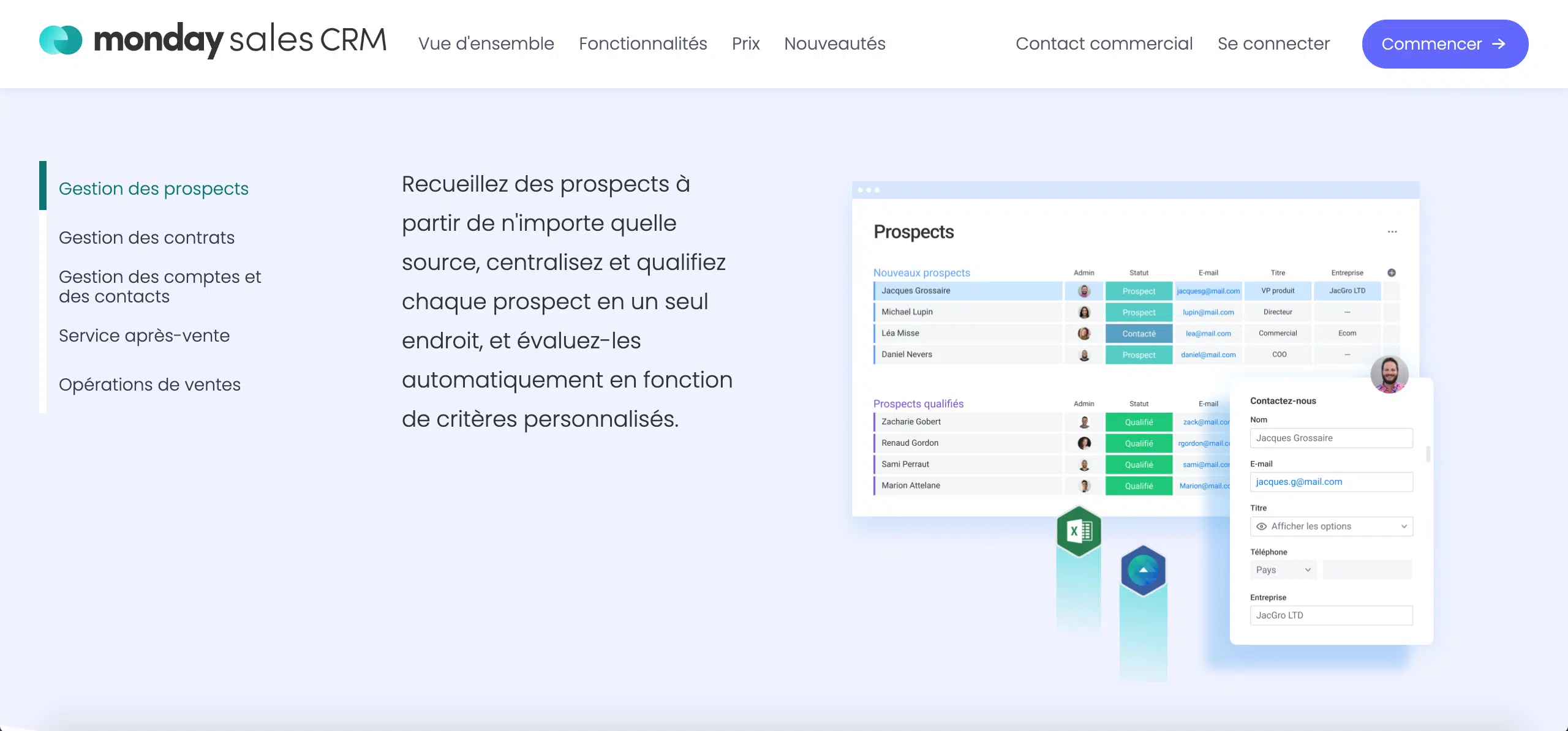 Fonctionnalités CRM – Source : Monday.com (à noter : des solutions comme HubSpot, Salesforce, Pipedrive ou Zoho CRM sont également de plus en plus adoptées pour leur richesse fonctionnelle et leur intégration avancée avec d’autres outils cloud en 2025)