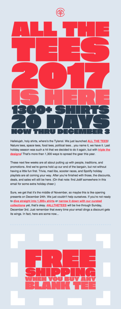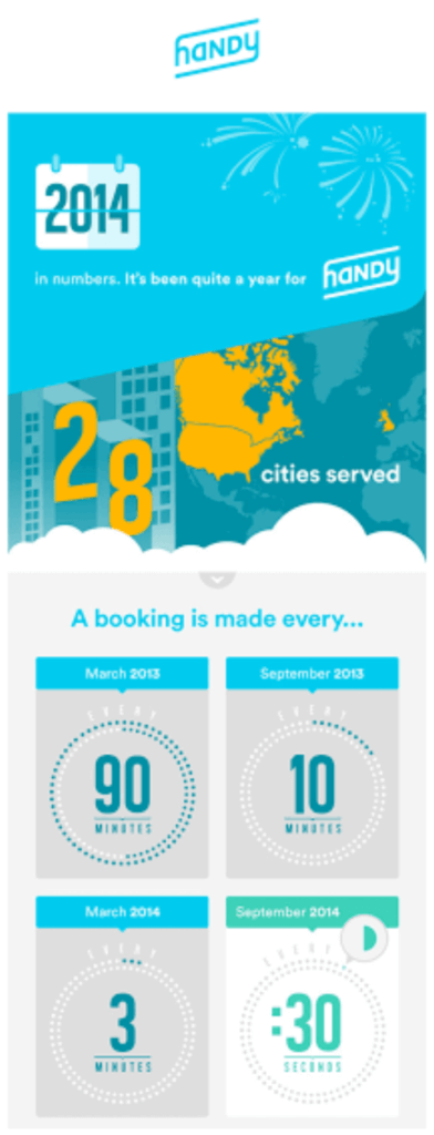 Un e-mail bien organisé ne veut pas dire qu’il ne peut pas être original. On voit notamment de nouvelles manières de délivrer un message, avec du texte écrit verticalement ou utilisant des formes géométriques. Le but est de maintenir l’ordre et l’intérêt visuel tout en proposant quelque chose de nouveau.