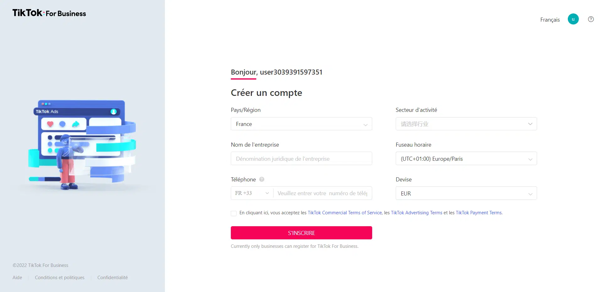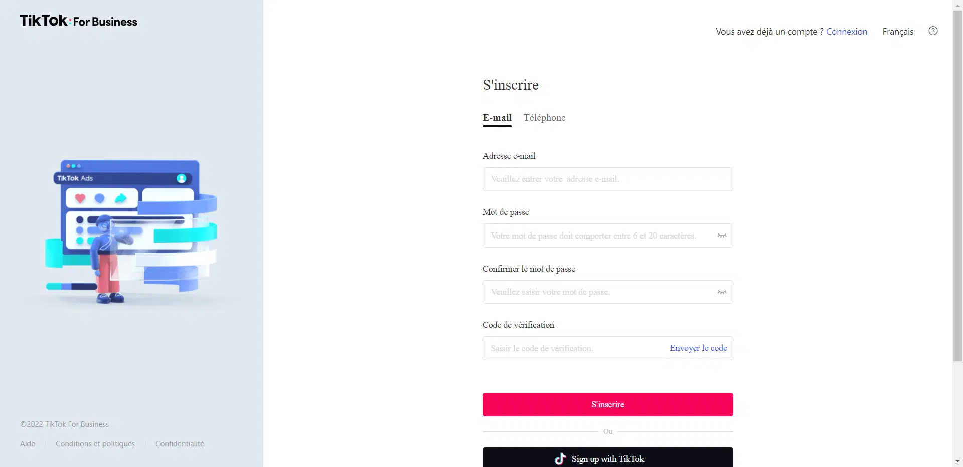 Pour créer votre compte, rendez-vous sur la page TikTok for Business, cliquez sur “Commencer maintenant” et suivez le guide !
