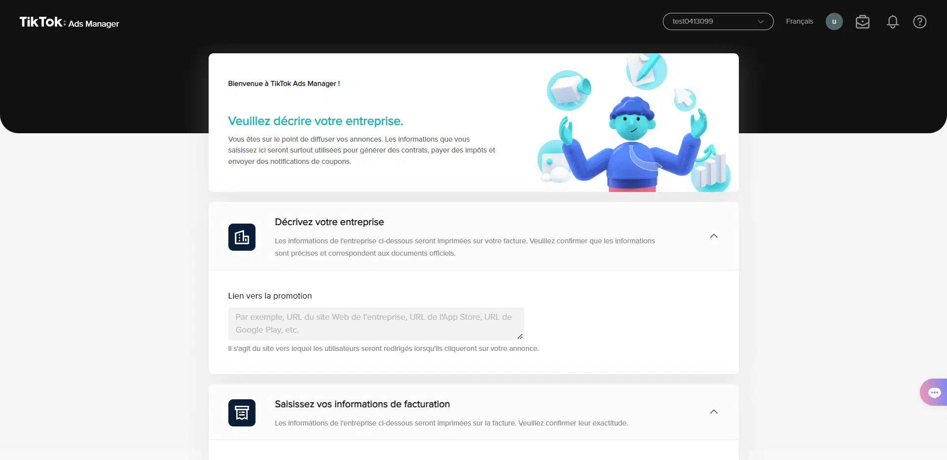 À cette étape, vous renseignez le site internet de votre entreprise, et vos informations de facturation. Vous accédez ensuite aux paramètres TikTok Ads, où vous allez définir vos préférences de campagnes publicitaires. Votre compte est créé, vous pouvez publier vos premières vidéos et campagnes marketing sur TikTok !