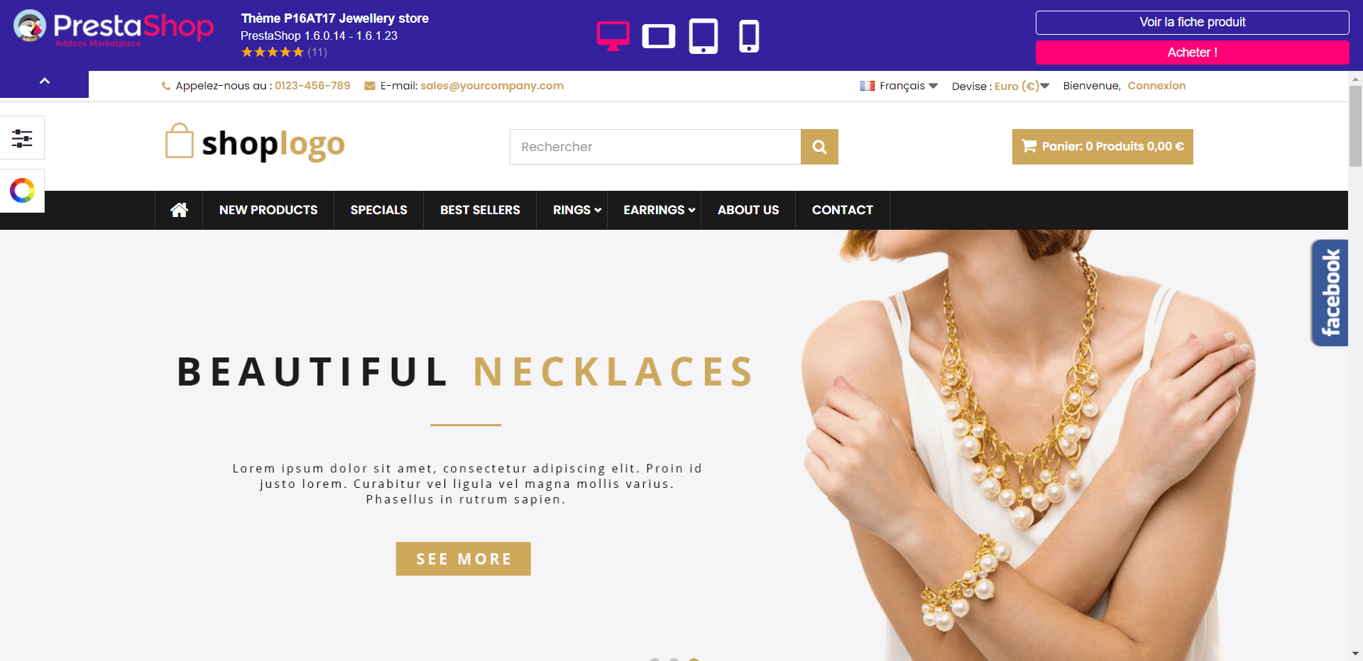 Le template de site PrestaShop, Jewellery store, est fait pour les bijouteries en ligne. Il propose un diaporama grand format sur la page d’accueil. Une barre de menu renvoi à différentes pages du site, vous pouvez ainsi diriger vos clients vers différentes gammes de bijoux. Le code couleur de base et le design sont propices à la vente de bijoux.