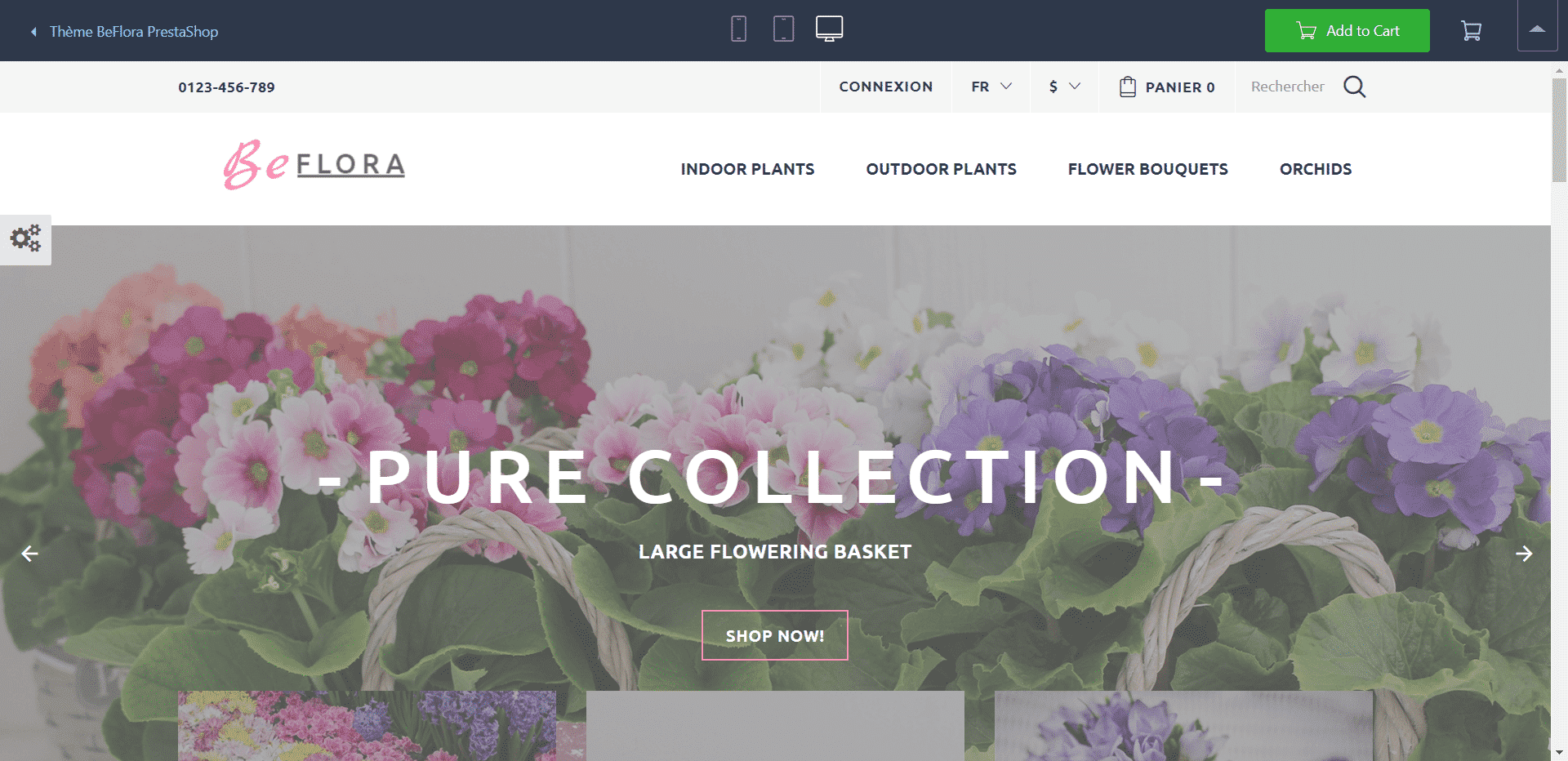 Pour vendre des bouquets ou autres compositions florales, vous pouvez opter pour le template PrestaShop gratuit, BeFlora. Celui-ci revêt un code couleur sobre et un design élégant capable de mettre en valeur les compositions que vous vendez. Si vous exportez vos fleurs, vous serez ravis de trouver une option multilingue et multidevise sur ce template.