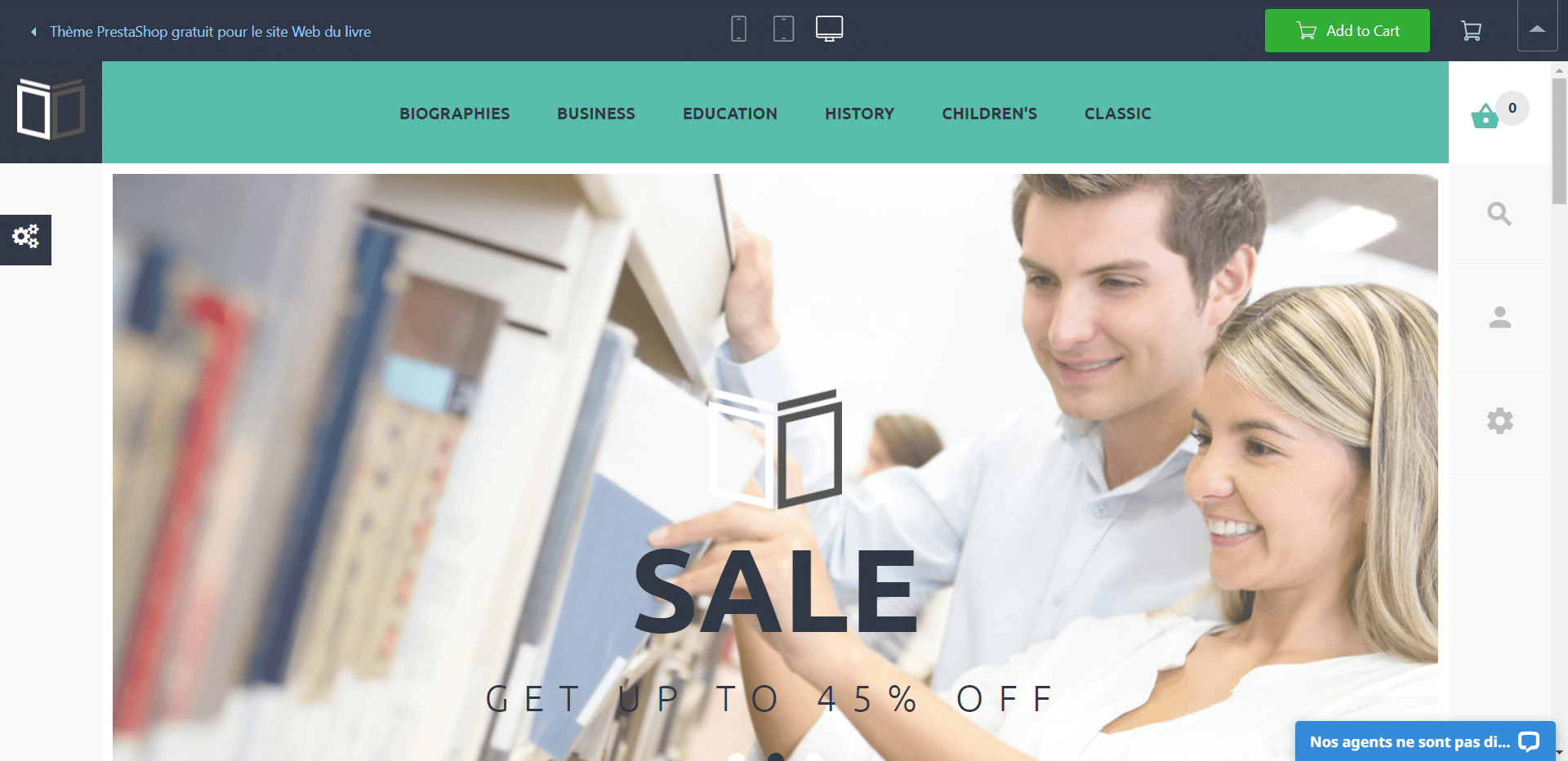 Le thème Book Hangover vous permet de vendre des livres, ou d’autres articles assez similaires, sans avoir recours à un template PrestaShop payant. Il s’adapte donc également à la vente de CD, ou de prêt à porter par exemple. Ce template attire l’attention sur les promotions et sur les caractéristiques de chaque produit, afin de mettre en valeur ses atouts en un clin d’œil grâce à des effets de survol sur chaque image.