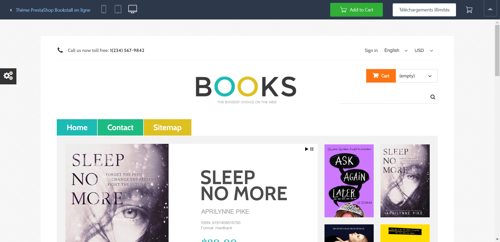 Si vous vendez des livres en ligne, ce template PrestaShop devrait vous séduire. Il est doté d’un diaporama qui fait défiler les bests-sellers et les nouveautés de façon dynamique. Son bas de page mène les visiteurs vers un menu où vous pouvez trier vos livres par thématiques et vers un raccourci vers plus de nouveautés et de livres à succès.