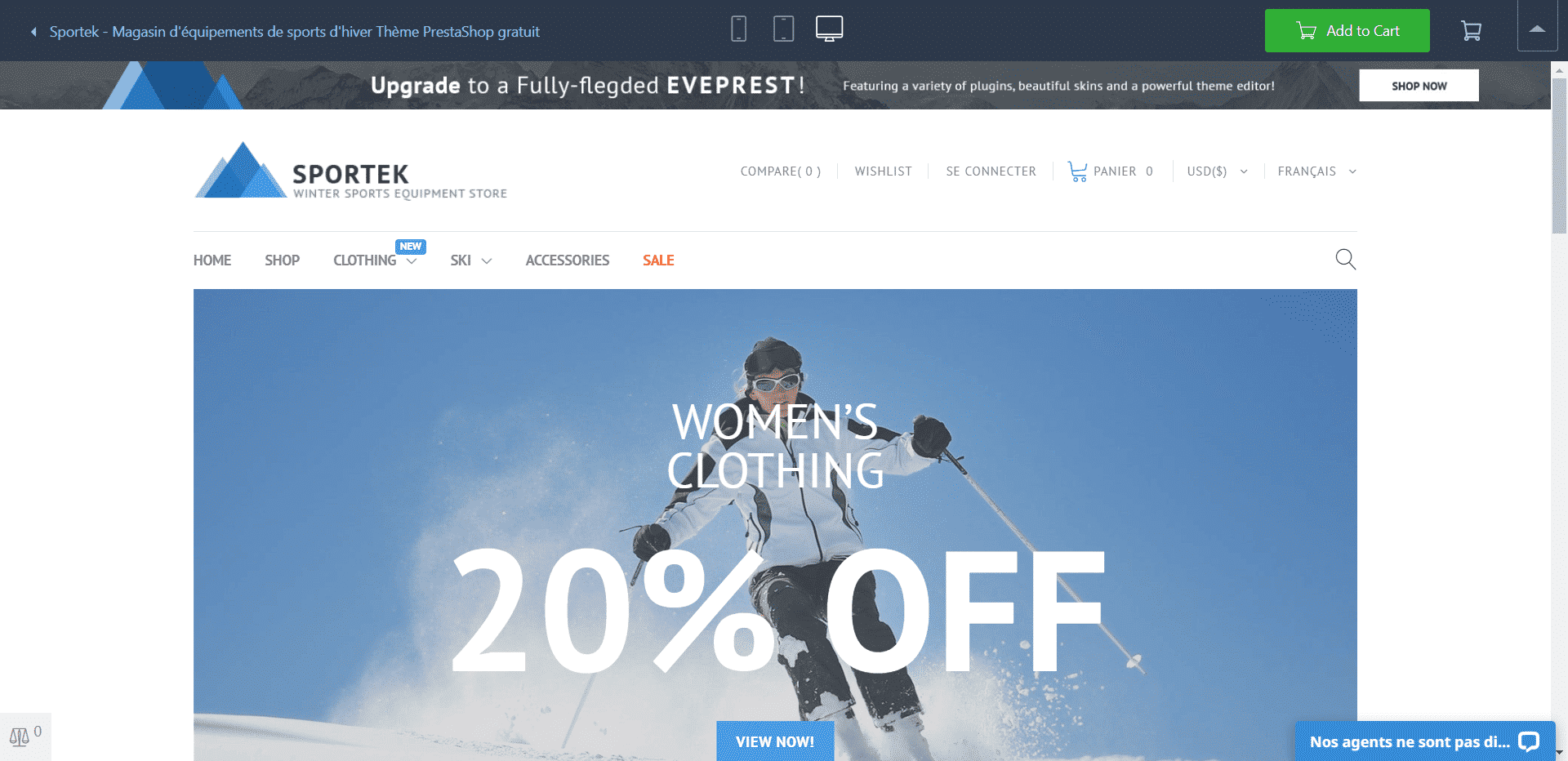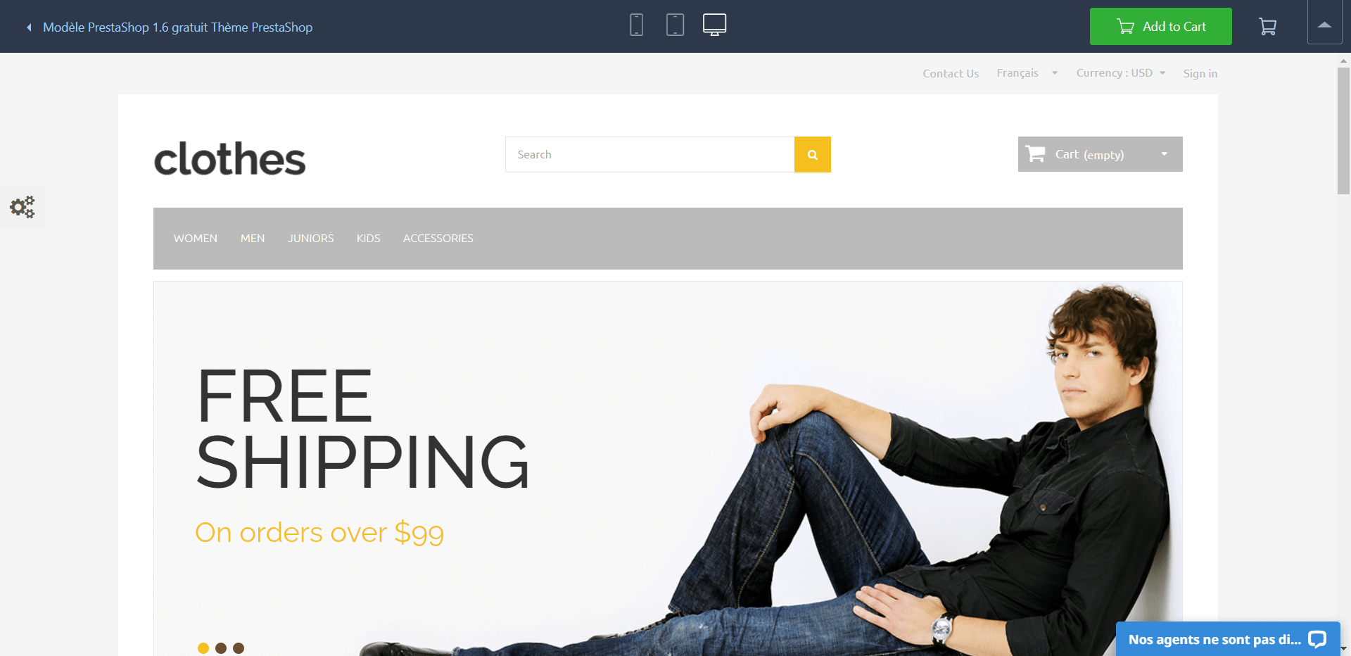 Si vous vendez des articles de sport, et que vous cherchez un thème gratuit pour votre ecommerce, ce template PrestaShop comblera certainement vos attentes. Il permet de proposer de nombreuses catégories et sous-catégories de produits. Il dispose d’une option de live chat pour permettre à vos clients de vous contacter directement. Il est également doté d’une option multilingue et multidevise pour vos clients basés à l’étranger.