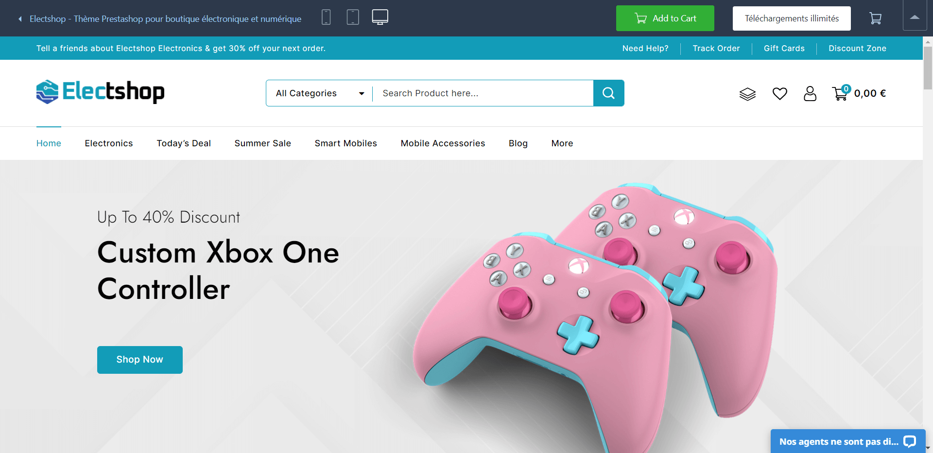 Le design épuré du template PrestaShop Electroshop met en avant de façon moderne les produits High Tech. L’onglet de live chat permet à vos clients de prendre contact avec votre support pour être guidé dans leurs achats, et la barre de recherche, idéalement enrichie par des modules de recherche avancée (type Doofinder ou Algolia, de plus en plus adoptés), permet de trouver rapidement le produit recherché.