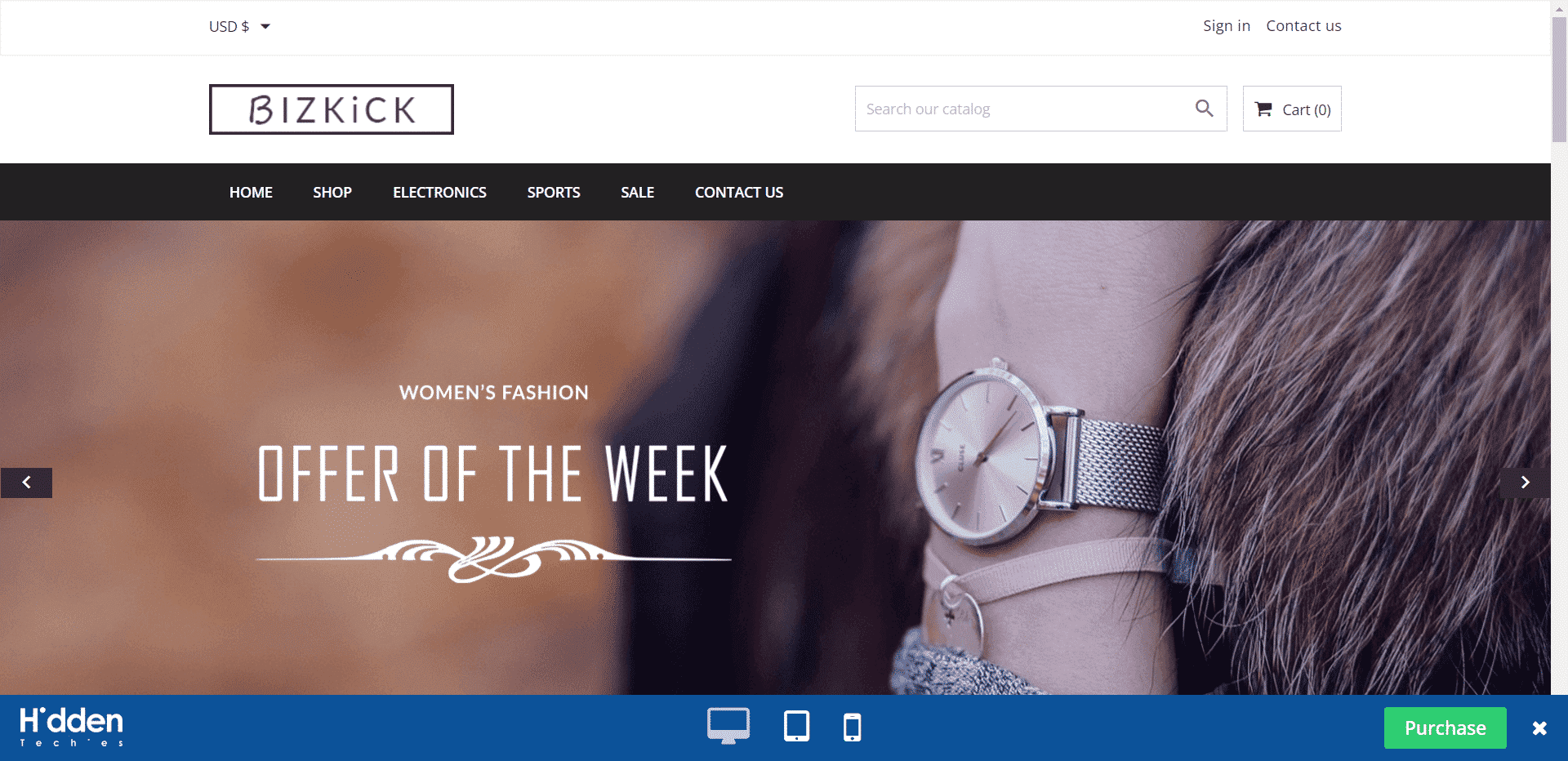 Le template gratuit BizKick est adapté à la vente en ligne de bijoux et d’accessoires de mode. Outre son design agréable et élégant, ce template propose des options de compte à rebours pour inciter vos clients à acheter avant la fin d’une promotion en cours, d’affichage du nombre d’articles en stock et d’estimation du délai de livraison. Ces fonctions participent à augmenter votre taux de conversion.