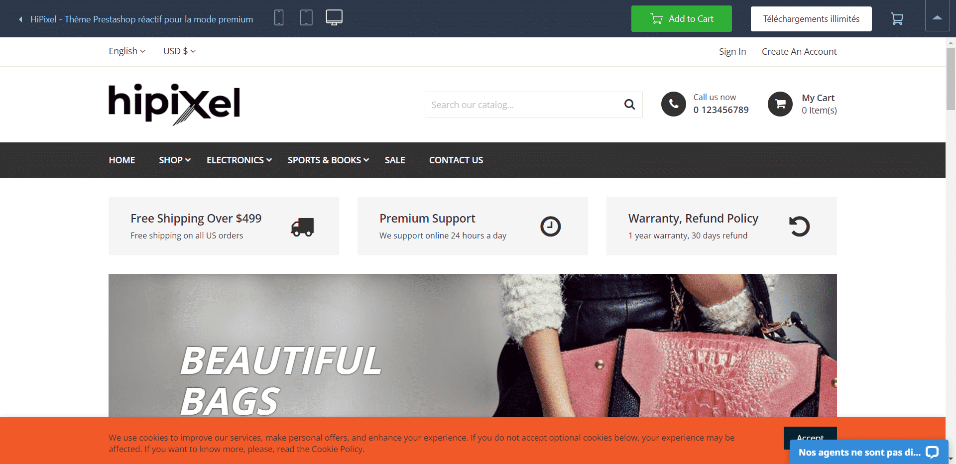Le thème HiPixel possède tous les atouts d’un template PrestaShop destiné aux boutiques en ligne d’accessoires de mode. Il propose notamment la mise en avant des frais de livraison, des modes de retour, et du panier. L’accueil vous permet de mettre en avant vos dernières collections, et le menu guide vos clients directement vers les catégories qui les intéressent. Ce modèle est multilingue et multidevise, c’est idéal pour vendre à l’international.