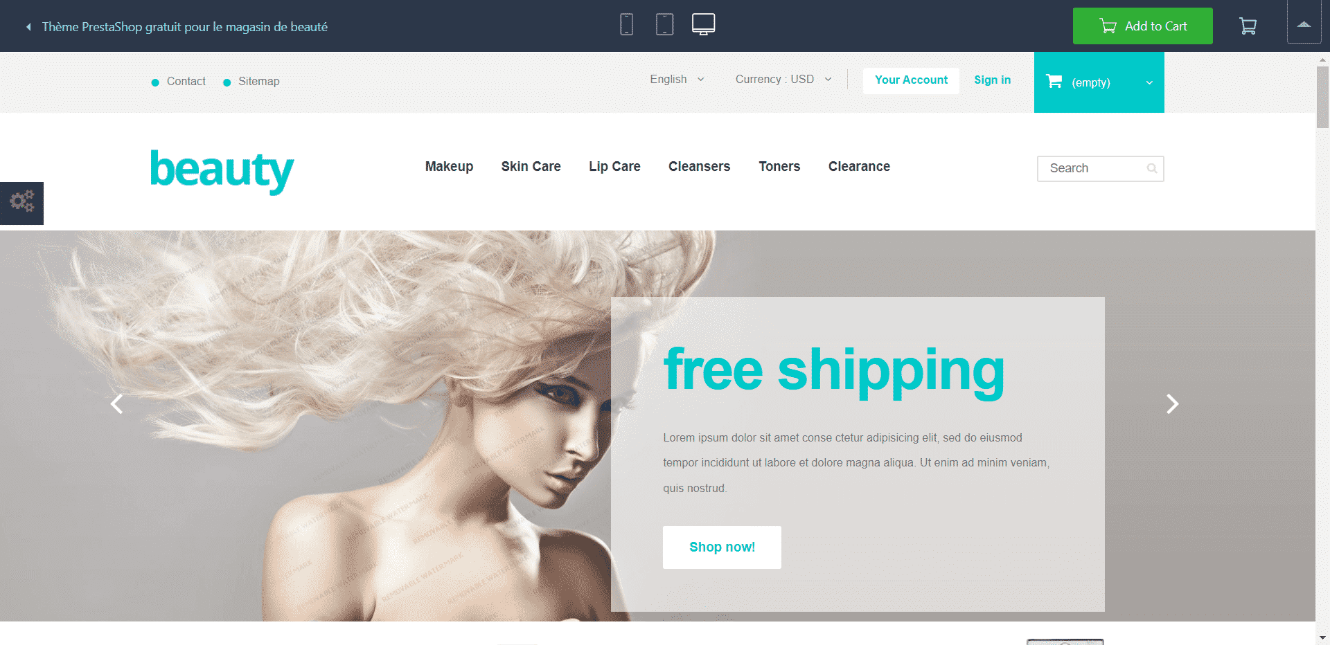 Ce thème PrestaShop gratuit offre toutes les options attendues pour un ecommerce de produits de beauté. Son code couleur s’accorde avec différents types de gammes de produits cosmétiques. Vous pouvez ainsi vendre en ligne des produits bio, des produits haut de gamme, des articles bien-être, du maquillage ou des soins pour le corps. Ce modèle est dynamique grâce à son diaporama pleine page, et à l’effet de survol qui anime les images de certains articles.