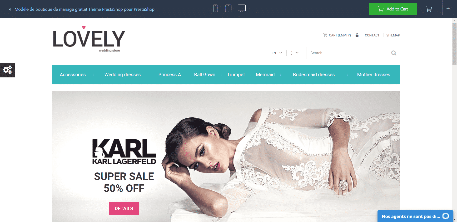 Le style épuré, aux couleurs douces de ce template PrestaShop est recommandé pour les boutiques en ligne de robes et d’articles pour les mariages. Il est lui aussi doté d’un live chat pour répondre aux questions de vos visiteurs. En outre, il propose un mode multidevise et multilingue pour vos ventes internationales. Il offre une option de Wishlist, désormais souvent synchronisée avec le compte client et accessible sur tous les appareils, ainsi qu’une note et des commentaires clients sur chaque article pour guider le choix de vos visiteurs.