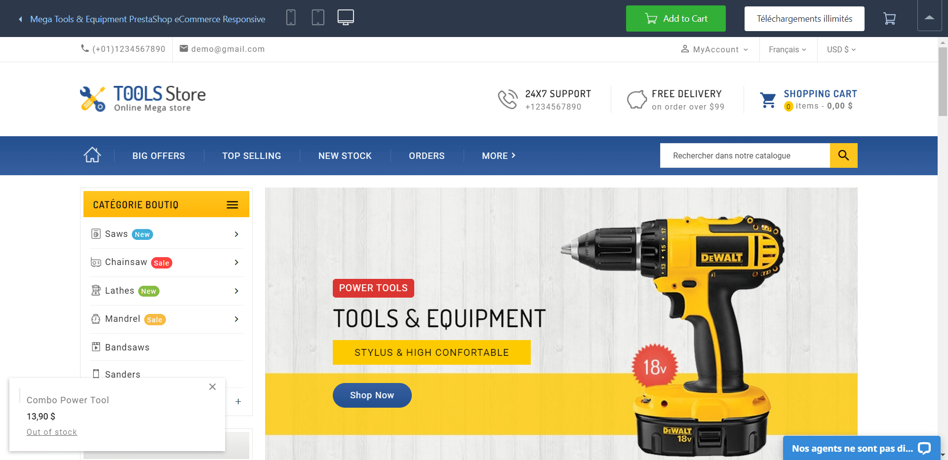 Le thème Mega Tools est pensé spécialement pour les ecommerces d’outillage. Le code couleur bleu et jaune, et la disposition des menus, ainsi que l’accès rapide au panier et au numéro de téléphone du support client sont de grands classiques de ce type d’ecommerce. Le live chat, désormais souvent intégré via des solutions modernes comme Tidio, Crisp ou l’automatisation par chatbot, permet aux visiteurs de dialoguer avec vos conseillers ou d’obtenir des réponses instantanées grâce à l’IA.