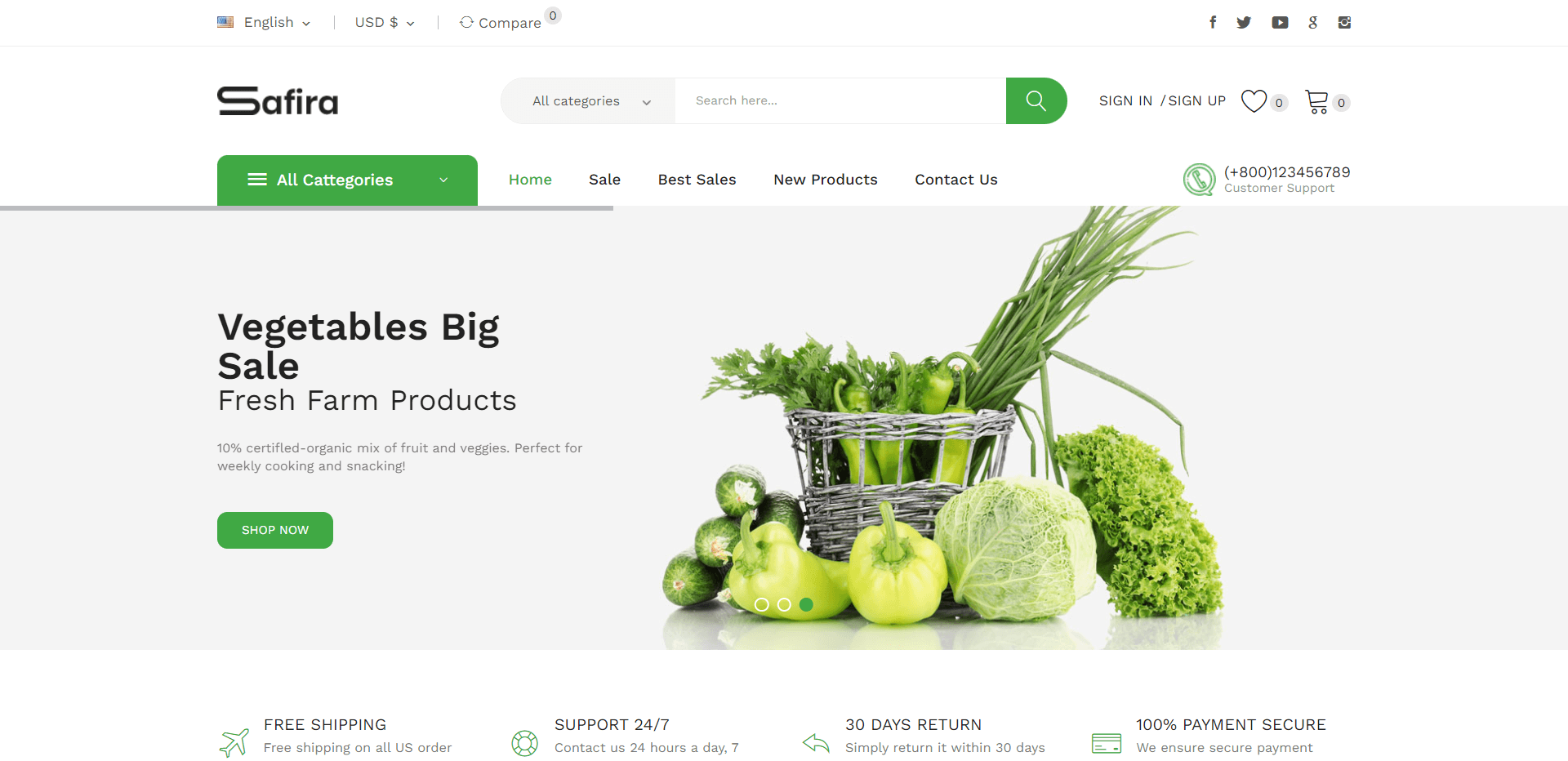 Safira est un thème parfaitement adapté aux ecommerces de produits alimentaires. Safira possède 4 versions différentes de sa page d’accueil, toutes dotées de bannières, de mégas-menus, de menus verticaux, et de diaporamas à grandes images. Toutes les pages sont dotées des options nécessaires au déploiement d’un site ecommerce alimentaire.