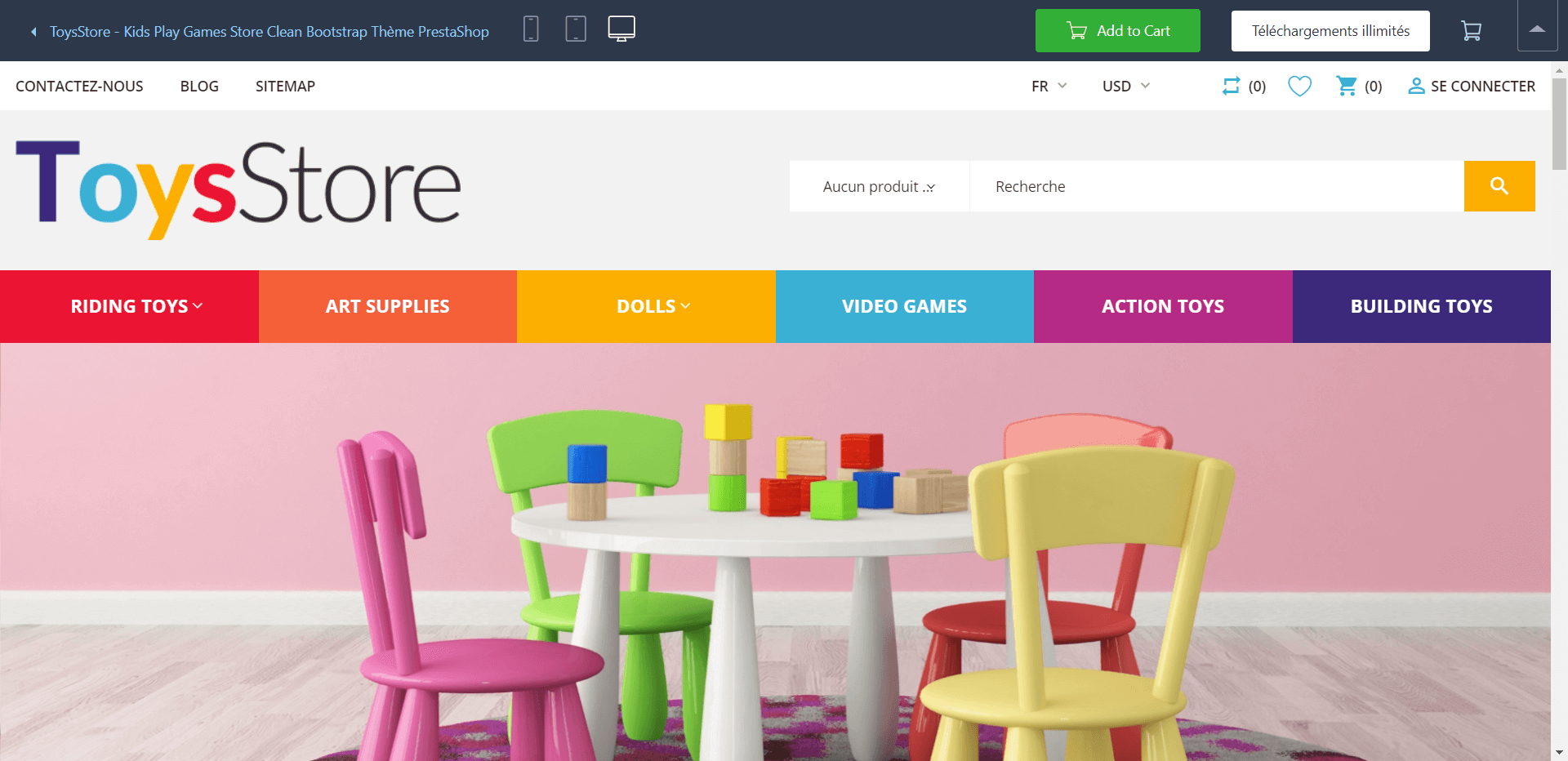 Ce modèle de sites PrestaShop se prête assez bien à la vente d’articles à destination des enfants, comme des jouets. Il est doté d’un menu à sous-catégories et d’une page d’accueil permettant de mettre en valeur vos offres en cours et vos articles du moment. Les couleurs claires de ce template font ressortir les couleurs vives des jouets pour enfants.