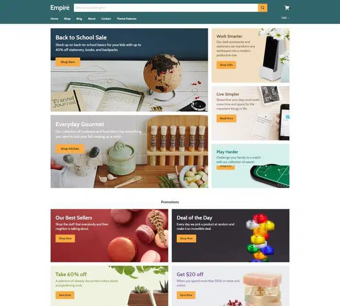 Empire est un thème ultra-puissant qui allie fonctionnalité et un design e-commerce impeccable. Avec la recherche en direct, le filtrage avancé et les options d’affichage axées sur les ventes, Empire est spécialement conçu pour les magasins avec de grands catalogues. Boostez les conversions et développez votre empire avec un thème aussi élégant qu’extensible.