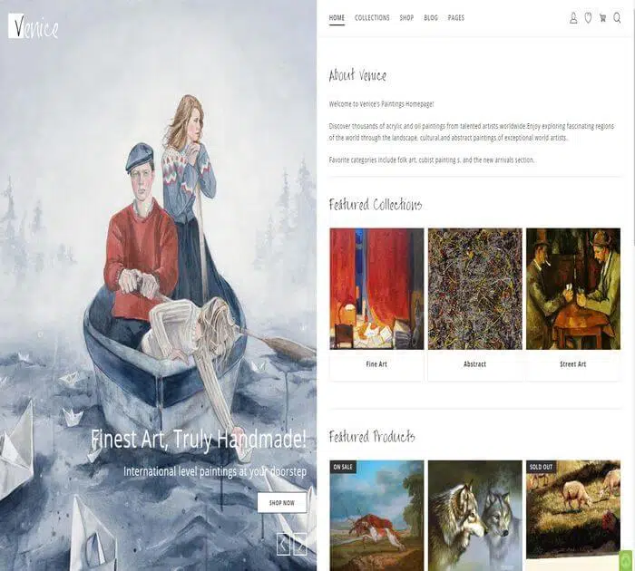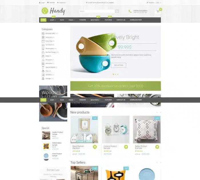 Handy est un thème Shopify responsive et facile à utiliser. Le thème Handy Shop est un bon début pour ceux qui cherchent à créer une boutique en ligne de produits artisanaux. Ce thème est livré avec de nombreuses fonctionnalités, comme la possibilité de personnaliser votre mise en page, un megamenu, des diaporamas vidéos … Vous pouvez également définir toutes les couleurs que vous voulez, définir une police personnalisée et bien d’autres choses encore.