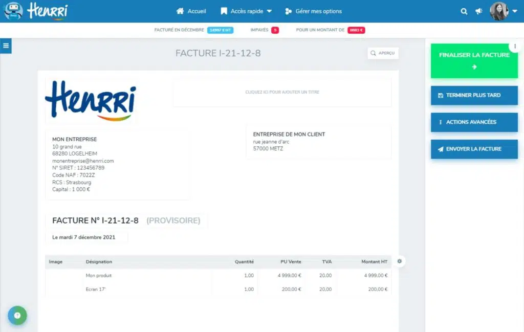 Présente comme « le meilleur logiciel de facturation », Henrri va simplifier votre quotidien de freelance. Vous pouvez créer et suivre vos e-factures, vos avoirs, vos devis, planifier des relances automatiques, etc.