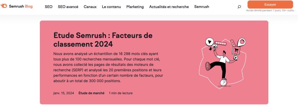 Semrush est un outil reconnu internationalement par les consultants SEO et régulièrement cité dans des études de cas et conférences spécialisées. Il permet de réaliser des analyses approfondies de mots-clés, de suivre les performances de sites et d’identifier des opportunités de backlinks. Toutefois, c’est aussi un blog de référence qui a l’avantage de pouvoir se baser sur les données de son propre outil pour fournir des informations. Il présente donc de nombreuses études de cas.