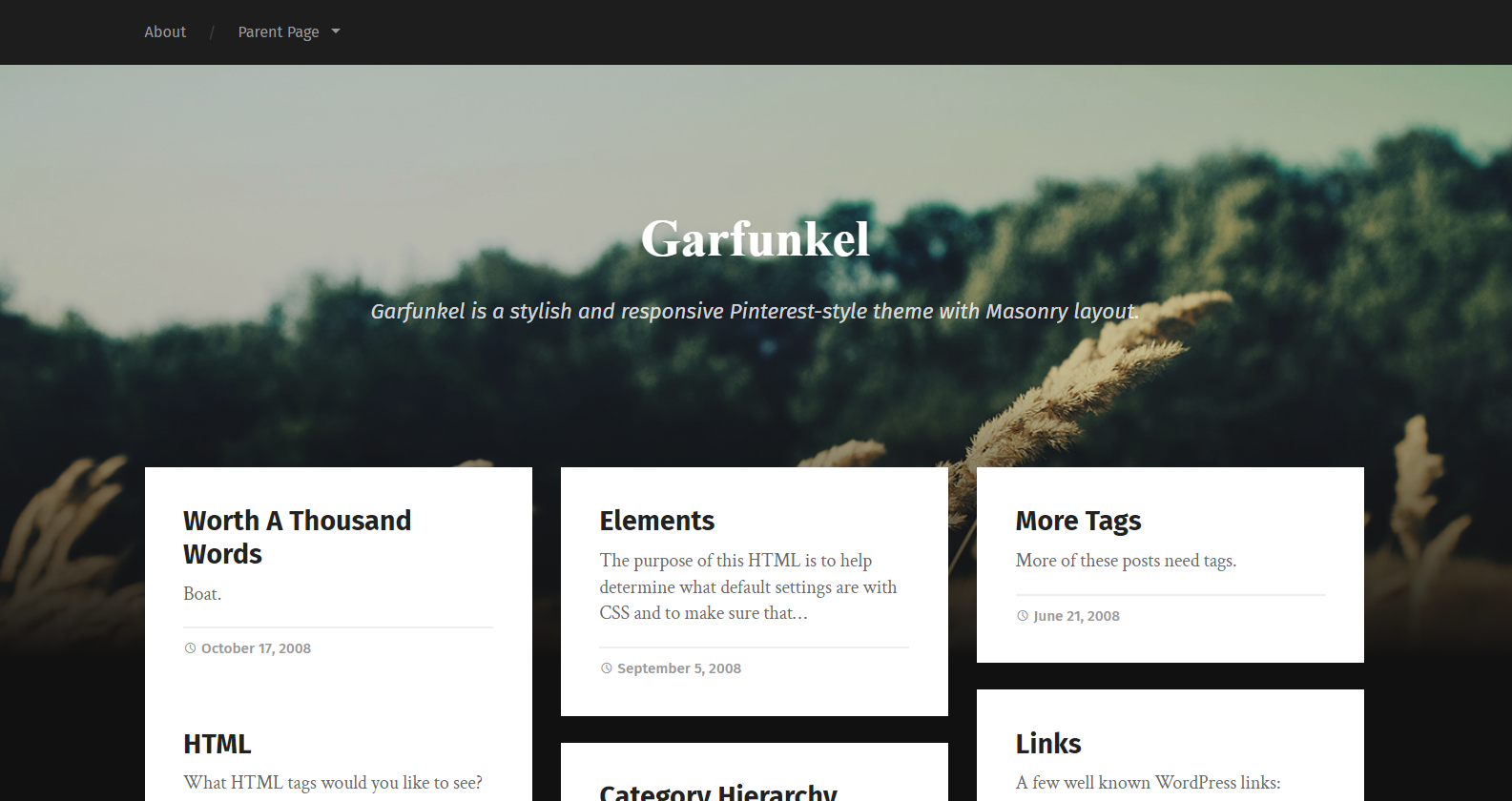 Garfunkel est un thème WordPress gratuit très indiqué pour un blog. Sa construction en bloc permet une visibilité optimale des divers articles de blog publiés sur le site web.