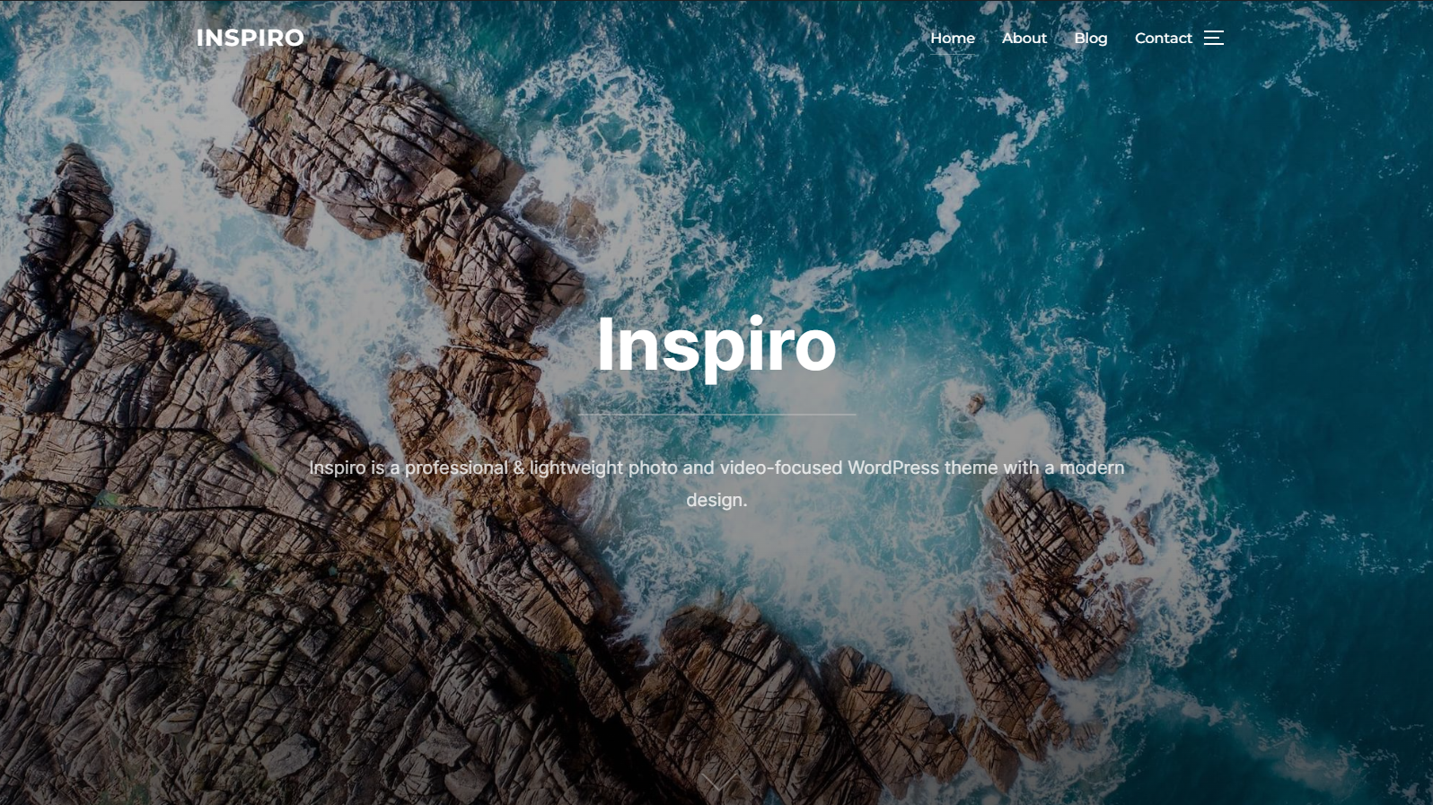 Inspiro est un thème WordPress gratuit développé par WPZOOM. Il est axé sur la légèreté pour ne pas alourdir votre site web. Cependant, il met l’accent sur la photo et la vidéo en vous proposant un header de page d’accueil en plein écran qui prend en charge YouTube ou encore Vimeo.