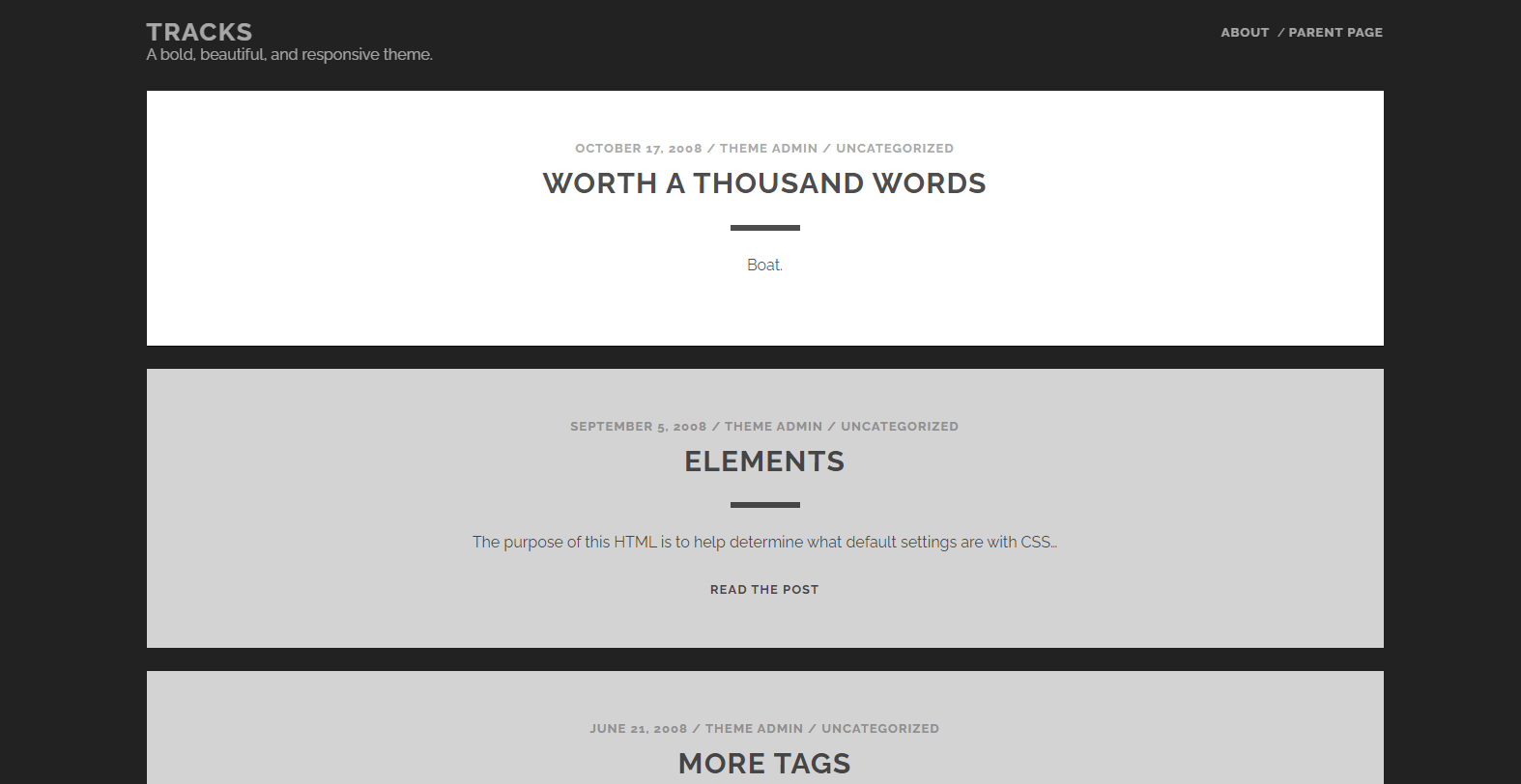 Tracks est le thème WordPress gratuit qui met en valeur votre contenu. Et en matière de contenu, on entend aussi, vos photos. Ce thème est un support de choix si vous souhaitez mettre en avant vos photos et tenir un blog photo par exemple. Il est épuré et minimaliste pour que l’attention ne se porte que sur ce que vous publiez.