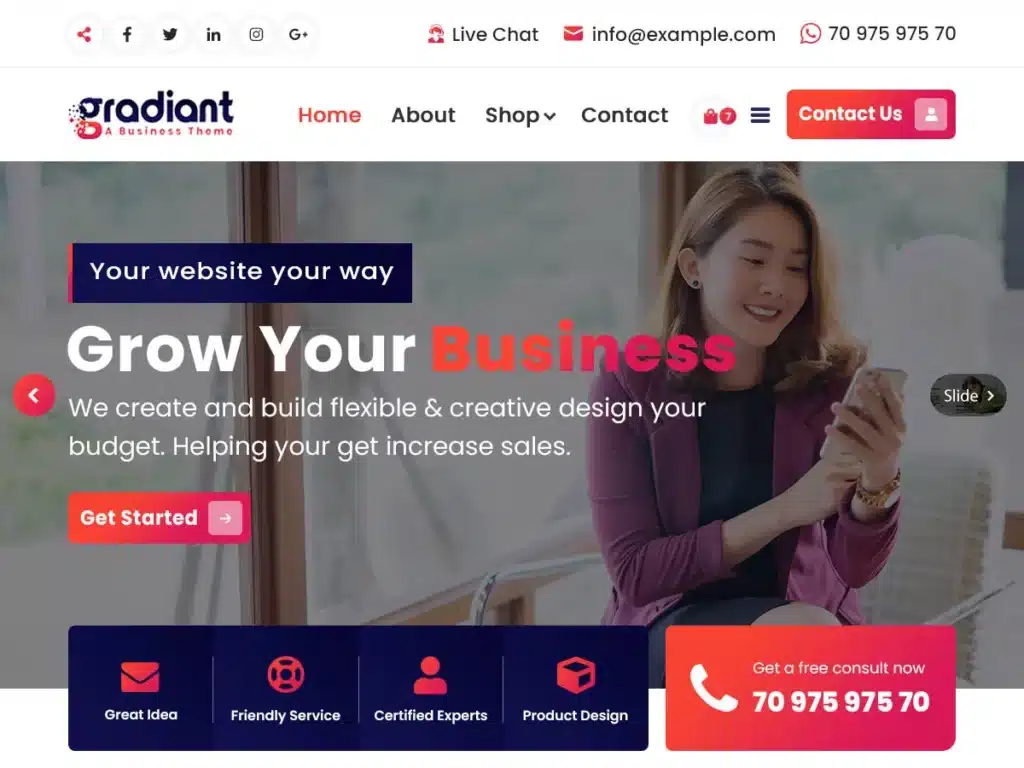 En version thème WordPress gratuit, Gradiant propose diverses types de personnalisation : Header, Slider, et des sections. Cependant vous n’aurez pas accès en version gratuite à la personnalisation des produits e-commerce, portfolio, grilles tarifaires, et les galeries d’images. Donc c’est un point à prendre en considération.