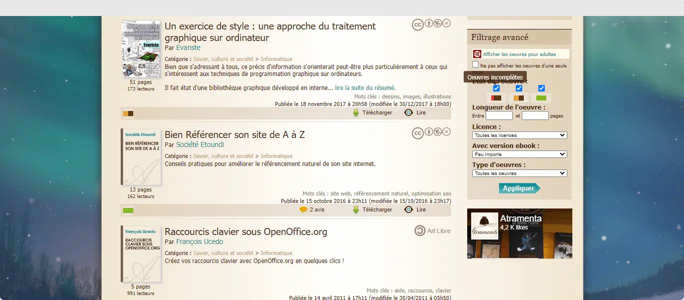 Malgré une interface très dépouillée, Livres pour tous propose plus de 6150 ebooks à lire gratuitement en ligne ou après téléchargement. À noter que de plus en plus de sites d’ebooks adoptent des interfaces modernes et responsives pour une meilleure expérience sur mobile. Les ebooks sont souvent au format ePub et PDF. Livres pour tous est l’un des meilleurs sites d’ebooks gratuits et un des plus complets. De plus, le site propose de nombreux livres à propos d’entrepreneuriat digital. L’onglet « Informatique » dévoile une mine de bouquins et guides à propos de conception de sites web, de graphisme ou de développement et langages web.