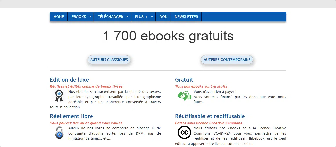 Soutenue par une association de promotion de la diffusion de la lecture, Bibebook est un site qui propose plus de 1700 ebooks à télécharger gratuitement. Les ebooks sont disponibles sous format PDF et ePub. Le format Kindle (Mobi) tend à être remplacé par ePub, désormais compatible avec la plupart des liseuses. La licence utilisée est la Creative Commons CC-BY-SA, qui autorise la réutilisation et la rediffusion libre. Bibebook met l’accent sur la fiction au détriment des livres-guides pratiques. C’est dommage pour ceux qui cherchent à accroître leurs connaissances et leurs compétences dans un domaine comme le commerce en ligne.