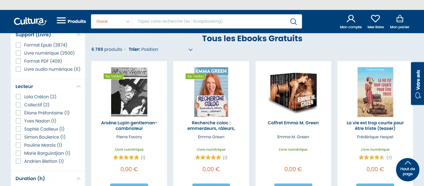 Le géant français du livre et des biens culturels Cultura propose pas moins de 3 400 ebooks à télécharger gratuitement. Les livres numériques sont disponibles sous format ePub. Un outil de recherche est possible, selon des critères de thème, de durée de lecture, de genres, et d’autres. Bonne nouvelle pour les créateurs d’entreprises sur le net, de nombreux livres traitent de marketing et de commerce en ligne, mais ces ebooks sont généralement payants.