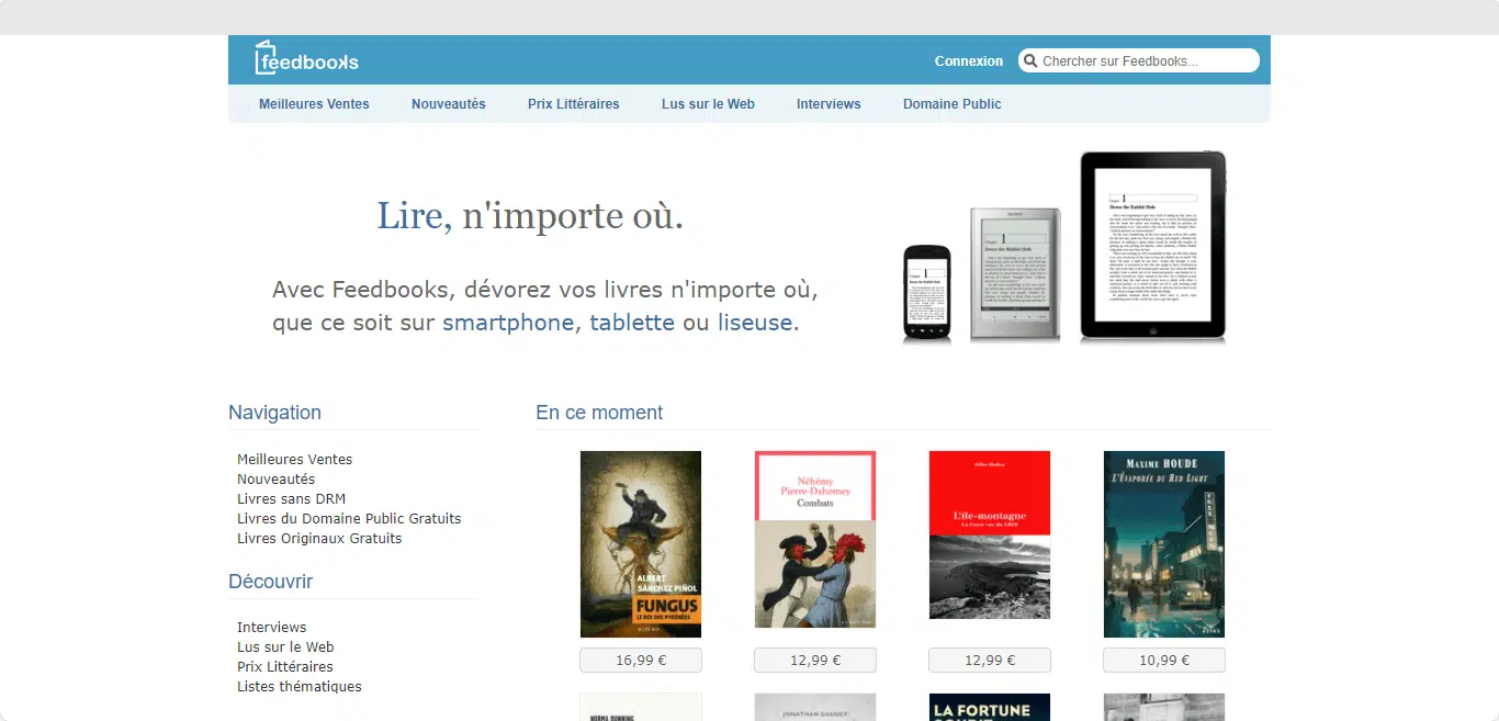 La librairie ouverte à Lyon en 1907, devenue Decitre, propose près de 5 000 ebooks gratuits à télécharger. Les formats Pdf et ePub ! La littérature sous toutes ses coutures, et les meilleures nouveautés sont en rayon sur les site, gratuitement ! Decitre propose également du payant, avec un système de bonus, de promotions en format numérique, qui vient récompenser les lecteurs fidèles. Decitre commercialise également la liseuse Vivlio, qui s’est imposée comme une alternative européenne de plus en plus adoptée face aux géants du secteur.