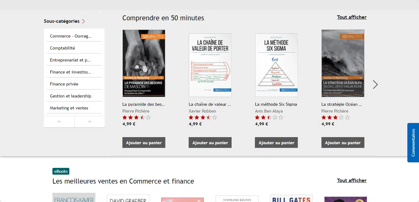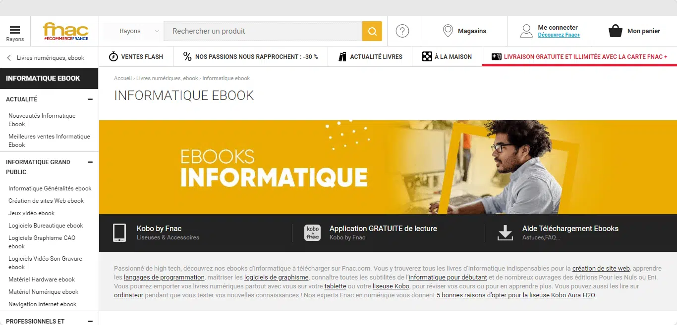 La plus importante enseigne de vente de biens culturels en France donne à découvrir un catalogue numérique très bien fourni, avec des livres payants et gratuits. Le site de la Fnac propose environ 500 ebooks à télécharger gratuitement au format ePub. Mais pour trouver des livres dédiés à l’entrepreneuriat web et au e-commerce, il faut se tourner vers le payant, avec plusieurs livres de la collection « Pour les nuls » consacrés à la programmation ou aux réseaux sociaux par exemple.