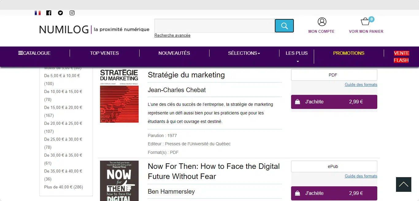 Sur NumiLog figurent à la fois des ebooks gratuits et des payants. Plus de 4000 livres numériques en français, principalement au format ePub et parfois au format PDF, sont listés sur le site. Un système de barèmes de prix permet de faire des trouvailles intéressantes selon son budget. De plus, on peut facilement dénicher plus de 1 000 ouvrages disponibles en anglais, ainsi que des ebooks dédié au marketing digital et à l’entrepreneuriat web à des prix très intéressants.